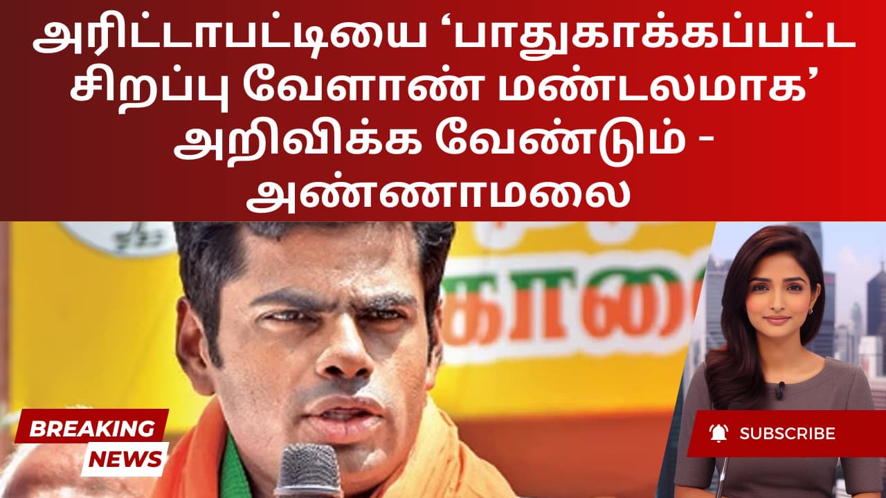 அரிட்டாபட்டியைச் சுற்றியுள்ள முழு மண்டலத்தையும் “பாதுகாக்கப்பட்ட சிறப்பு வேளாண் மண்டலமாக” அறிவிக்க வேண்டும் என்று தமிழக பாஜக தலைவர் கே அண்ணாமலை மாநில அரசை வலியுறுத்தினார். திங்களன்று கிராமத்தில் நடந்த கூட்டத்தில் உரையாற்றும் போது அவர் இந்த அறிக்கையை வெளியிட்டார். இப்பகுதியில் டங்ஸ்டன் சுரங்கத் திட்டம் ரத்து செய்யப்பட்டதைத் தொடர்ந்து அவரது கோரிக்கை எழுந்துள்ளது.