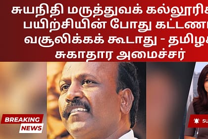 தமிழ்நாட்டில் உள்ள சுயநிதி மருத்துவக் கல்லூரிகள் மருத்துவ மாணவர்களிடமிருந்து பயிற்சிக் காலத்தில் கட்டணம் வசூலிக்கக் கூடாது என்று சுகாதார அமைச்சர் சுப்பிரமணியன் புதன்கிழமை தெரிவித்தார். பாதிக்கப்பட்ட ம...
