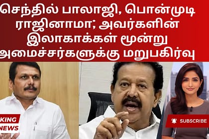 மின்சாரம், மதுவிலக்கு மற்றும் கலால் துறை அமைச்சர் வி செந்தில் பாலாஜி மற்றும் வனம் மற்றும் காதி துறை அமைச்சர் கே பொன்முடி ஆகியோர் ஸ்டாலின் தலைமையிலான அமைச்சரவையில் இருந்து ராஜினாமா செய்தனர். அவர்களின் ...