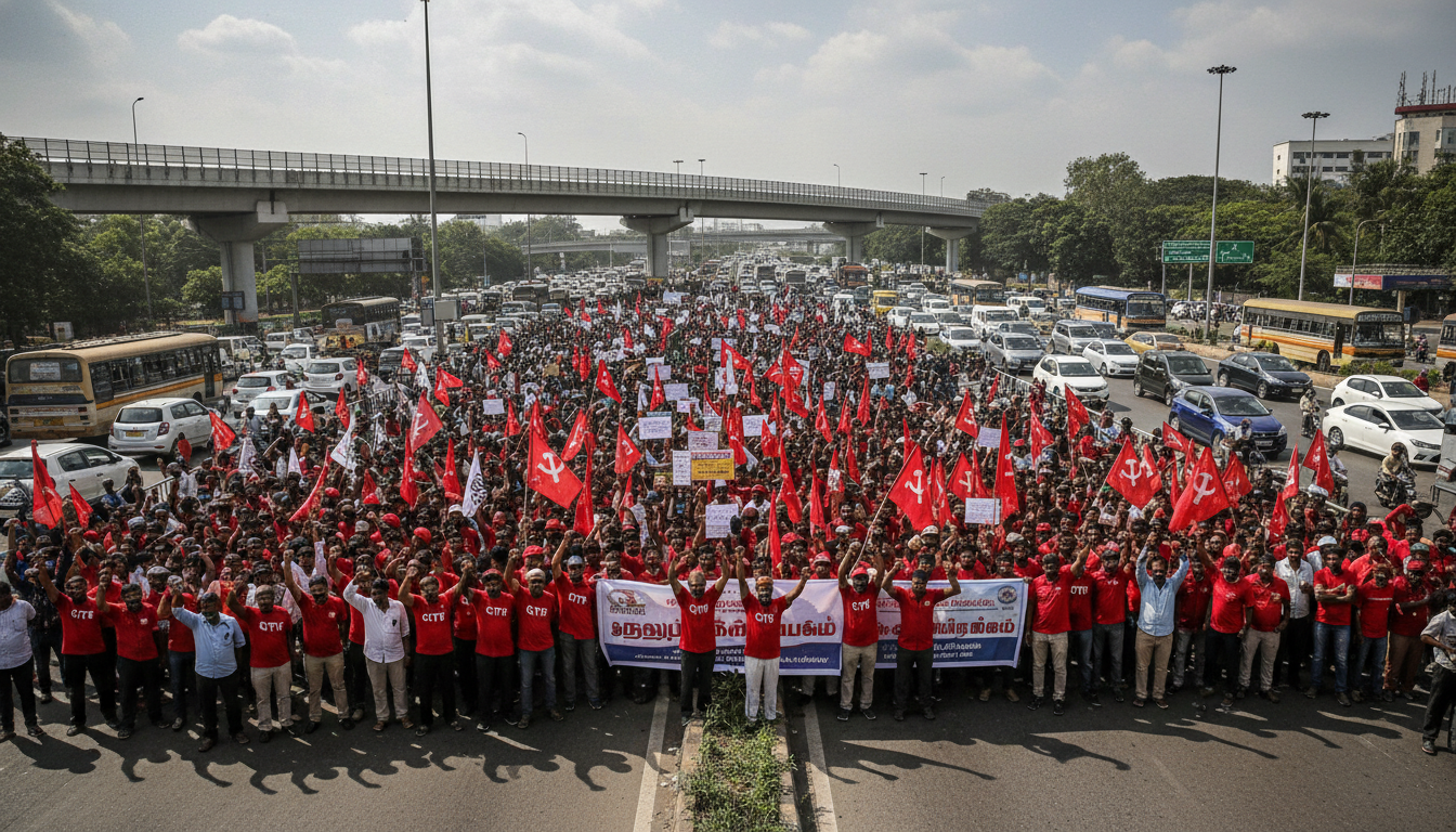 இந்நிலையில், பிப்ரவரி 12-ம் தேதியான இன்று, நாடு தழுவிய அளவில் தொழிற்சங்கங்களின் வேலைநிறுத்தம் மற்றும் போராட்டங்களுக்கு அழைப்பு விடுக்கப்பட்டிருந்தது. இதன் ஒரு பகுதியாக, சென்னையின் முக்கியத் தொழில் மற்றும் போக்குவரத்து மையமான கிண்டியில், சிஐடியு அமைப்பைச் சேர்ந்த நூற்றுக்கணக்கான தொழிலாளர்கள் இன்று ஒன்று திரண்டனர்.