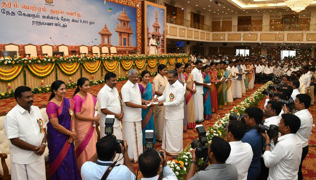 சென்னை: தமிழக இளைஞர்களின் அரசுப் பணி கனவை நனவாக்கும் வகையில், இன்று நடைபெற்ற பிரம்மாண்டமான நிகழ்வில் தமிழ்நாடு முதலமைச்சர் மு.க.ஸ்டாலின் அவர்கள் 9,801 நபர்களுக்கு அரசுப் பணி நியமன ஆணைகளை வழங்கினார். தமிழக அரசின் பல்வேறு துறைகளில் காலியாக உள்ள பணியிடங்களை நிரப்புவதை முன்னுரிமையாகக் கொண்டு செயல்பட்டு வரும் திமுக அரசு, நிர்வாகத் திறனை மேம்படுத்தும் நோக்கில் இந்த அதிரடி நடவடிக்கையை மேற்கொண்டுள்ளது.