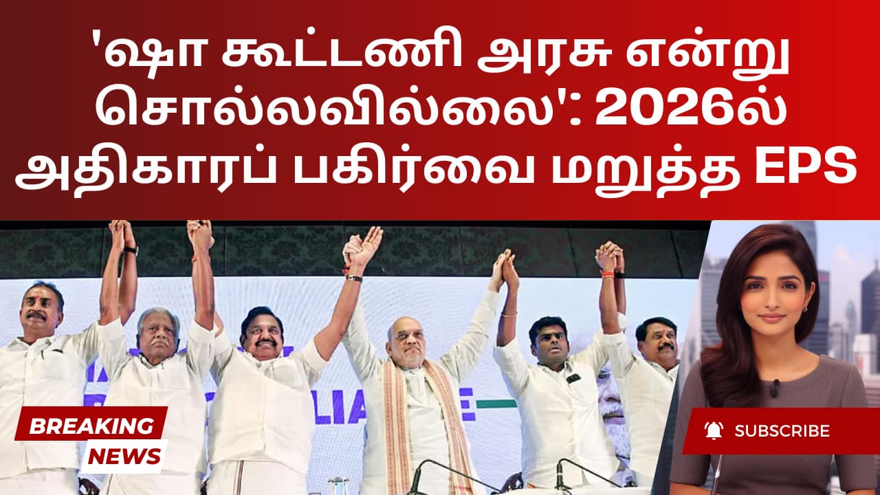 பாஜக தலைமையிலான தேசிய ஜனநாயகக் கூட்டணியில் அதிமுக அதிகாரப்பூர்வமாக மீண்டும் இணைந்த ஐந்து நாட்களுக்குப் பிறகு, தனது மௌனத்தை கலைத்து, கட்சியின் பொதுச் செயலாளர் எடப்பாடி கே பழனிசாமி புதன்கிழமை 2026 சட்டமன்றத் தேர்தலுக்குப் பிறகு தமிழகத்தில் கூட்டணி ஆட்சிக்கான சாத்தியக்கூறுகளை உறுதியாக நிராகரித்தார். ஏப்ரல் 11 அன்று சென்னையில் நடைபெற்ற முறையான கூட்டணி அறிவிப்பின் போது மத்திய உள்துறை அமைச்சர் அமித் ஷா தெரிவித்த கருத்துகளுக்கு இபிஎஸ் அளித்த இந்த அறிக்கை நேரடியாக முரண்படுகிறது.