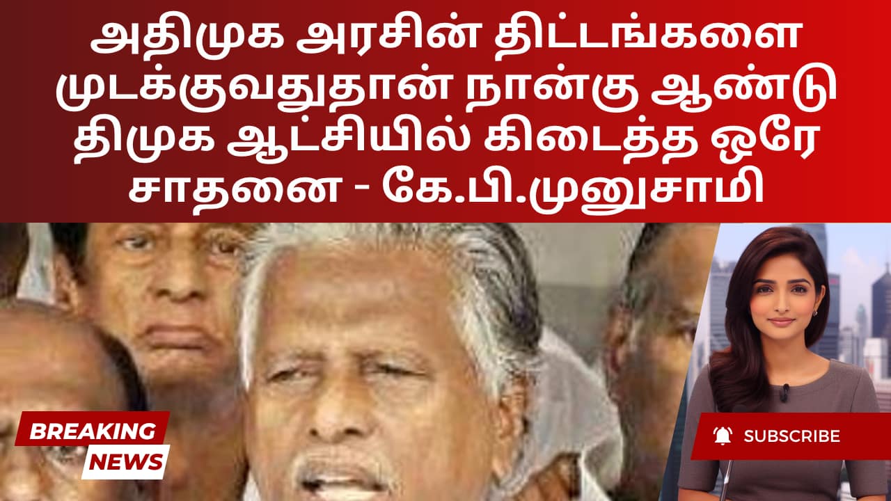 அதிமுக துணைப் பொதுச் செயலாளர் கே பி முனுசாமி ஞாயிற்றுக்கிழமை திமுக அரசை விமர்சித்தார். முந்தைய அதிமுக ஆட்சியின் போது தொடங்கப்பட்ட பல நலத்திட்டங்களை திமுக அரசு நிறுத்திவிட்டதாக அவர் குற்றம் சாட்டினார். ஊடகங்களுக்கு பேட்டியளித்த அவர், தமிழகம் முழுவதும் உள்கட்டமைப்பு மற்றும் வாழ்வாதாரத்தை மேம்படுத்துவதற்காக வடிவமைக்கப்பட்ட நன்மை பயக்கும் திட்டங்கள் செயலற்ற தன்மையாலும், முடக்கப்பட்டதாலும் திமுகவின் நான்கு ஆண்டு பதவிக்காலம் குறிக்கப்பட்டுள்ளது என்று குற்றம் சாட்டினார்.
