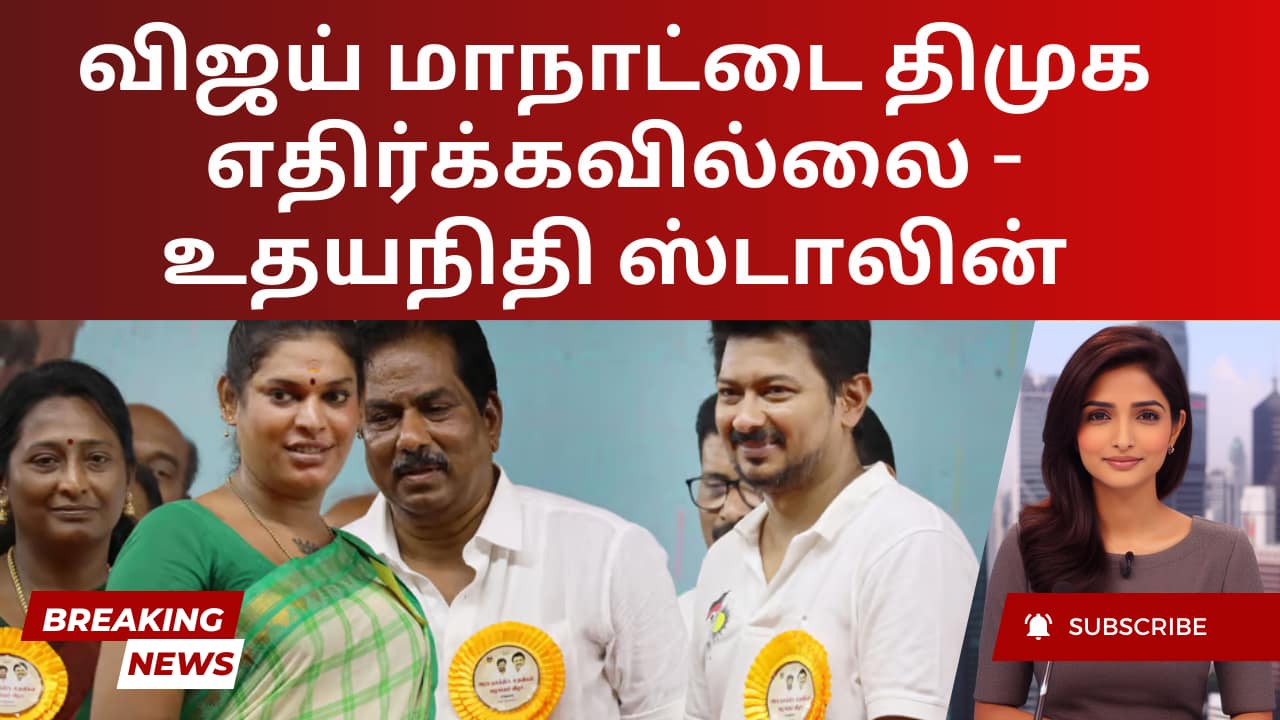 மதுரையில் நடைபெற்ற நிகழ்ச்சியொன்றின் போது இளைஞர் நலன் மற்றும் விளையாட்டு மேம்பாட்டுத்துறை அமைச்சர் உதயநிதி ஸ்டாலின், நடிகரும், அரசியல்வாதியுமான விஜய் நடத்தும் மாநாட்டிற்கு திமுக எதிர்ப்பு இல்லை என்று தெளிவுபடுத்தினார். சுமார் 25,000 பயனாளிகளுக்கு 300 கோடி ரூபாய் மதிப்பிலான நலத்திட்டங்களை விநியோகித்த பின்னர் அவர் இதனைத் தெரிவித்தார்.