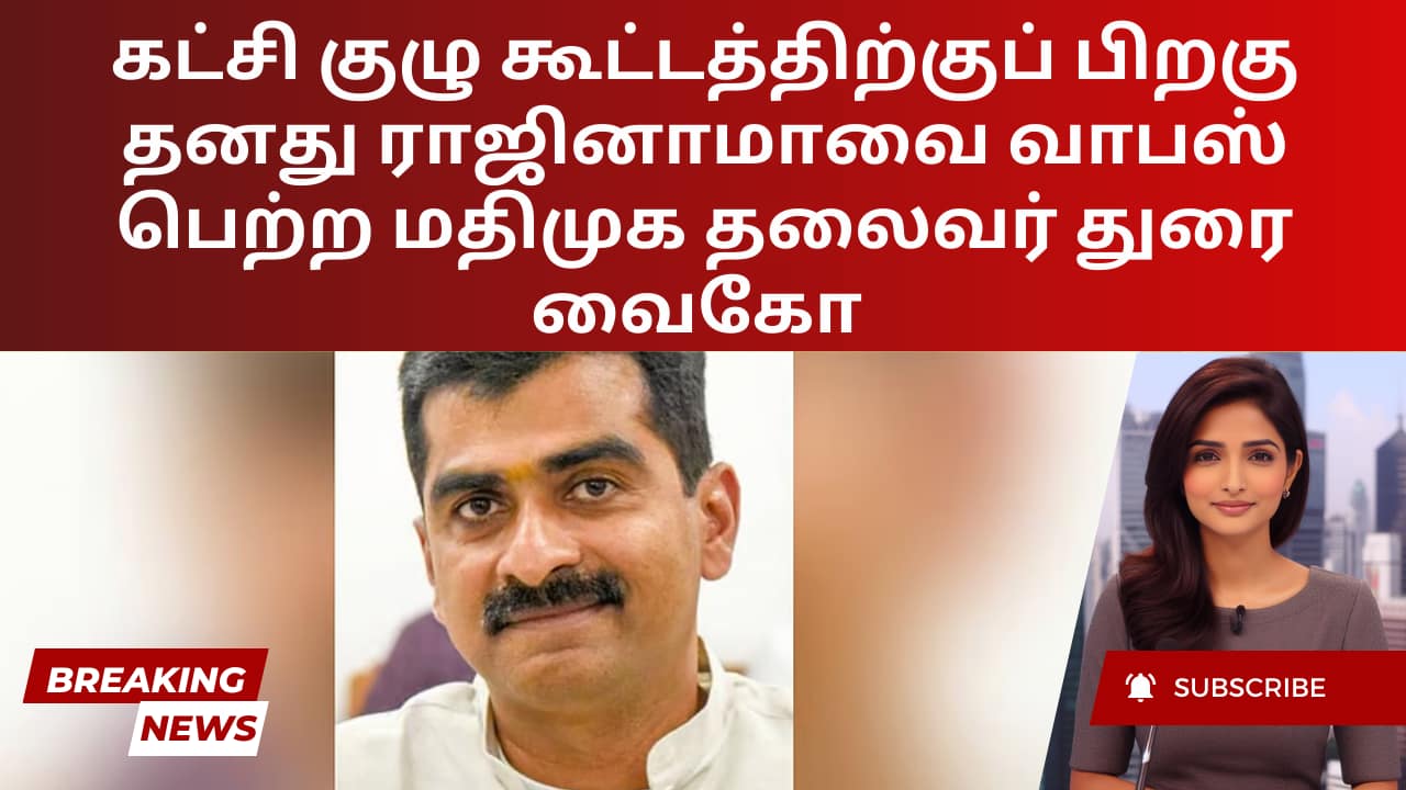 ஒரு வியத்தகு திருப்பமாக, ஞாயிற்றுக்கிழமை நடைபெற்ற ஒரு முக்கிய கட்சிக் கூட்டத்திற்குப் பிறகு, மதிமுக முதன்மைச் செயலாளர் துரை வைகோ தனது ராஜினாமாவை வாபஸ் பெற்றார். கட்சியின் மாவட்டச் செயலாளர்கள் மற்றும் நிர்வாகக் குழு உறுப்பினர்கள் அவரை மறுபரிசீலனை செய்யுமாறு வலியுறுத்தியதைத் தொடர்ந்து இந்த முடிவு எடுக்கப்பட்டது. கட்சியின் துணைப் பொதுச் செயலாளர் மல்லை சத்யாவுடன் அதிகரித்து வரும் பதட்டங்களுக்கு மத்தியில், துரை வைகோ தனது ராஜினாமாவை ஒரு நாள் முன்னதாக அறிவித்தார்.