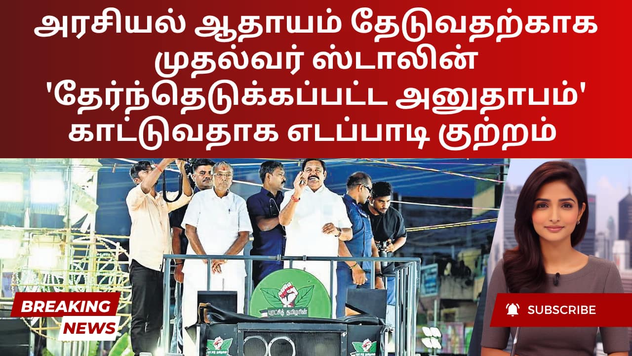 அதிமுக பொதுச் செயலாளரும் முன்னாள் முதலமைச்சருமான எடப்பாடி கே பழனிசாமி வெள்ளிக்கிழமை, கரூர் துயரத்தை அரசியல் ஆதாயத்திற்காக முதலமைச்சர் மு க ஸ்டாலின் பயன்படுத்துவதாகக் குற்றம் சாட்டினார். பாதிக்கப்பட்டவர்களின் குடும்பத்தினரைச் சந்திக்க ஸ்டாலின் வருகை கருணையால் அல்ல, மாறாக வரவிருக்கும் சட்டமன்றத் தேர்தலுக்கு முன்னதாக தேர்தல் கணக்கீடுகளால் ஏற்பட்டது என்று அவர் குற்றம் சாட்டினார். கடந்த ஆண்டு கள்ளக்குறிச்சியில் நடந்த சாவுகள் உட்பட இதேபோன்ற துயரங்களை ஸ்டாலின் புறக்கணித்ததாகவும், அரசியல் லாபத்திற்காக மட்டுமே கரூர் வந்ததாகவும் பழனிசாமி குற்றம் சாட்டினார்.
