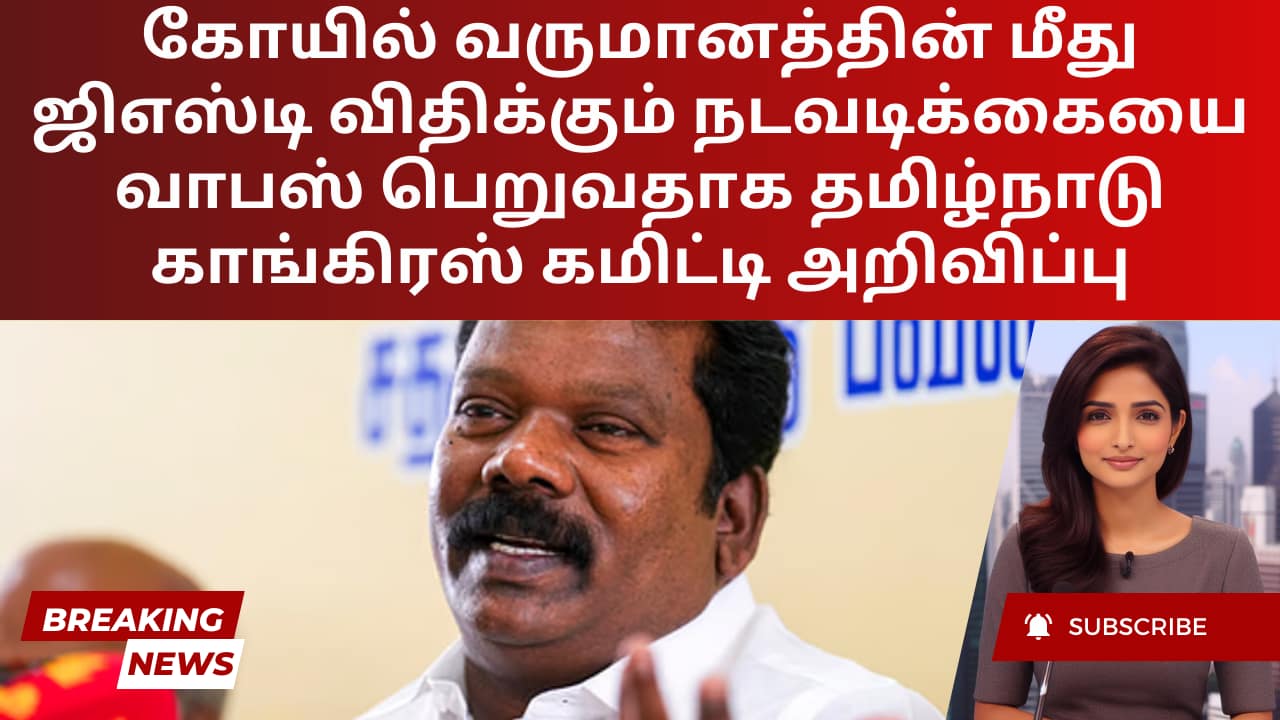கோயில் வருமானத்தின் மீது ஜிஎஸ்டி விதிக்கும் நடவடிக்கையை வாபஸ் பெறுவதாக தமிழ்நாடு காங்கிரஸ் கமிட்டி அறிவிப்பு