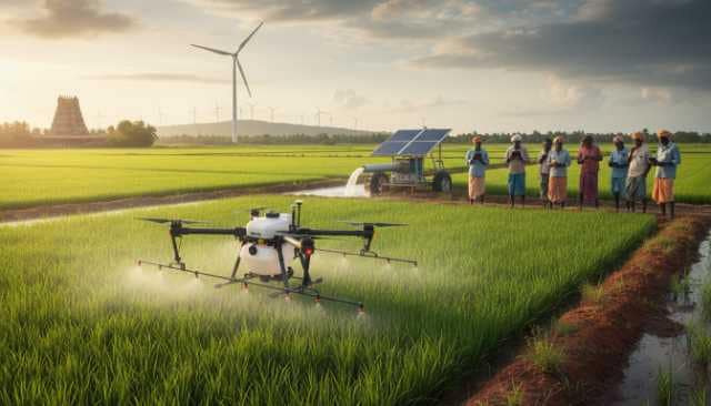 தமிழக விவசாயத்தில் சமீபகாலமாக பெரும் பேசுபொருளாக மாறியிருப்பது ட்ரோன்களின் பயன்பாடு ஆகும். குறிப்பாக பூச்சிக்கொல்லி மருந்துகளைத் தெளிப்பதில் ட்ரோன்கள் முக்கிய பங்கு வகிக்கின்றன. ஒரு ஏக்கர் நிலத்தில் மருந்து தெளிக்க மனித உழைப்பு தேவைப்படும்போது குறைந்தபட்சம் அரை நாள் ஆகும். ஆனால், ட்ரோன்கள் மூலம் அதே வேலையை வெறும் 10 முதல் 15 நிமிடங்களில் முடித்துவிட முடிகிறது. இது நேரத்தை மிச்சப்படுத்துவது மட்டுமல்லாமல், மருந்துகளைச் சீராகத் தெளிக்கவும் உதவுகிறது.