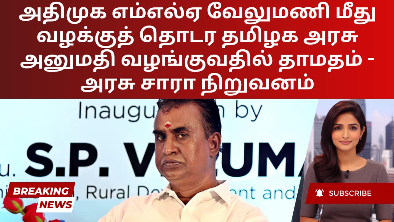 சென்னையைச் சேர்ந்த அறப்போர் இயக்கம் என்ற தன்னார்வ தொண்டு நிறுவனம், முன்னாள் அமைச்சரும் அதிமுக எம்எல்ஏவுமான எஸ் பி வேலுமணி மீது குற்றப்பத்திரிகை தாக்கல் செய்ய ஊழல் தடுப்பு மற்றும் கண்காணிப்பு இயக்குநரகத்திற்கு தேவையான அனுமதியை தமிழக அரசு தாமதப்படுத்தி வருவதாகக் குற்றம் சாட்டியுள்ளது. விசாரணை முடிந்த போதிலும், ஒரு வருடத்திற்கும் மேலாக தாமதம் நீடித்து வருவதாக அந்த தன்னார்வ தொண்டு நிறுவனம் தெரிவித்துள்ளது.