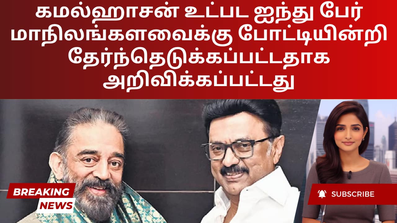 மக்கள் நீதி மய்யம் தலைவர் கமல்ஹாசன், ஆளும் திமுகவைச் சேர்ந்த மூன்று வேட்பாளர்களும், எதிர்க்கட்சியான அதிமுகவைச் சேர்ந்த இரண்டு வேட்பாளர்களும் தமிழ்நாட்டிலிருந்து மாநிலங்களவைக்கு போட்டியின்றி தேர்ந்தெடுக்கப்பட்டுள்ளனர். வேட்புமனுக்களை திரும்பப் பெறுவதற்கான காலக்கெடு வியாழக்கிழமை முடிவடைந்ததை அடுத்து, தேர்தல் அதிகாரி பி சுப்பிரமணியம், வெற்றி பெற்ற ஆறு வேட்பாளர்களுக்கும் தேர்தல் சான்றிதழ்களை அதிகாரப்பூர்வமாக வழங்கினார்.