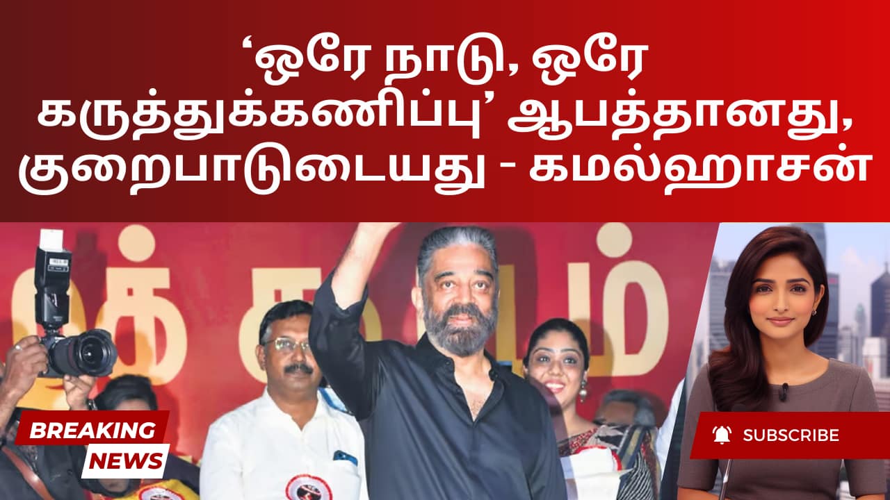 நடிகரும், அரசியல்வாதியுமான கமல்ஹாசன், ‘ஒரே தேசம், ஒரே தேர்தல்’ என்ற கருத்துக்கு, இது ஆபத்தானது மற்றும் தவறானது என்று கடும் எதிர்ப்பு தெரிவித்துள்ளார். சனிக்கிழமையன்று தனது கட்சியான மக்கள் நீதி மையம் பொதுக்குழு கூட்டத்தில் பேசிய கமல்ஹாசன், இந்தியாவுக்கு ஒரே நேரத்தில் தேர்தல்கள் தேவையில்லை, ஏனெனில் அவை பாதகமான விளைவுகளை ஏற்படுத்தக்கூடும் என்றார்.