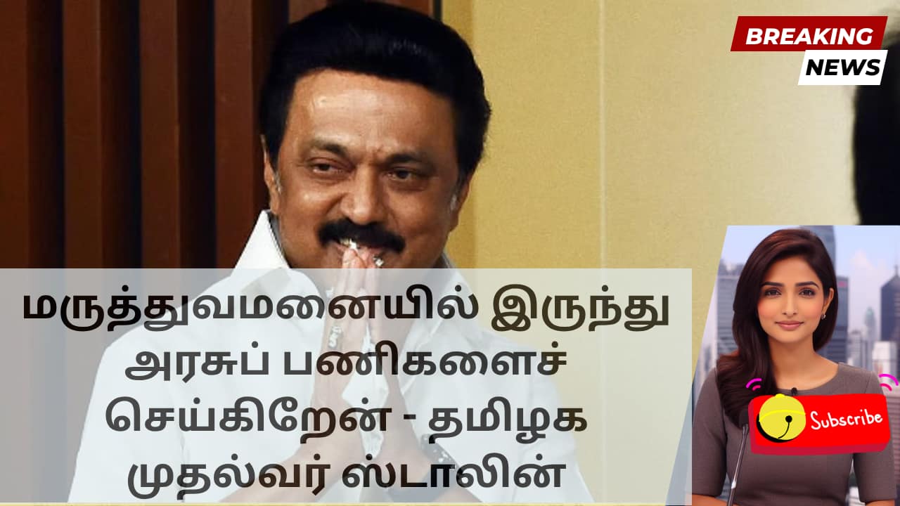 சென்னை அப்பல்லோ மருத்துவமனையில் மருத்துவ பரிசோதனைகளுக்கு உட்படுத்தப்பட்டு வரும் முதலமைச்சர் மு க ஸ்டாலின், செவ்வாய்க்கிழமை மருத்துவமனையில் இருந்தபடியே தனது அலுவல் பணிகளைத் தொடர்வதாக அறிவித்தார். மருத்துவ மேற்பார்வையில் இருந்தபோதிலும், மருத்துவமனையில் தங்கியிருக்கும் போது அரசின் செயல்பாடுகள் தடையின்றி இருக்கும் என்று பொதுமக்களுக்கு உறுதியளித்தார்.