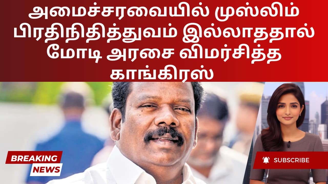 நரேந்திர மோடி தலைமையிலான தேசிய ஜனநாயகக் கூட்டணி அரசு முஸ்லிம்களை அமைச்சரவையில் சேர்க்கவில்லை என்றும், அவர்களுக்கு நாடாளுமன்ற இடங்களை ஒதுக்கத் தவறிவிட்டதாகவும் தமிழ்நாடு காங்கிரஸ் கமிட்டித் தலைவர் கே செல்வப்பெருந்தகை வியாழக்கிழமை விமர்சித்தார். மொழி அல்லது மதத்தின் அடிப்படையில் பாகுபாடு காட்டுவதை அரசியலமைப்பு தடைசெய்கிறது, ஆனால் தற்போதைய அமைச்சரவையில் முஸ்லிம்களுக்கு பிரதிநிதித்துவம் இல்லை என்று அவர் எடுத்துரைத்தார்.