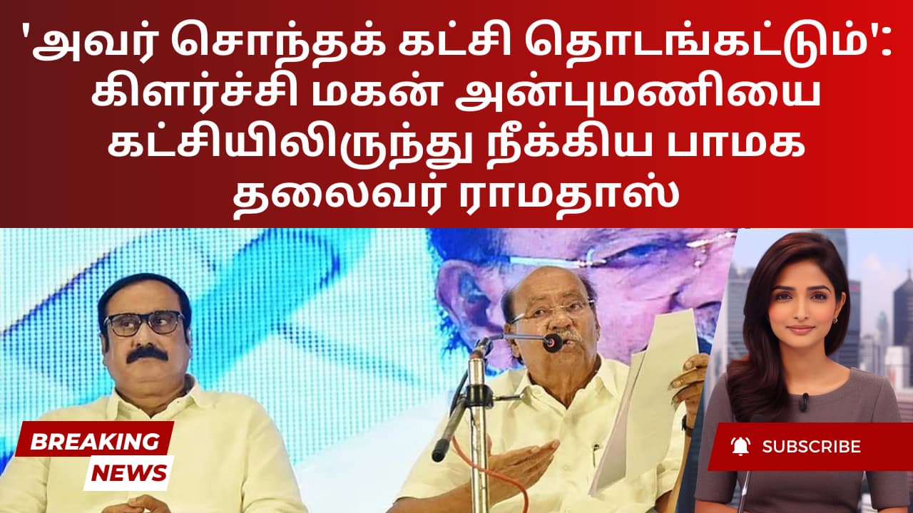 பாட்டாளி மக்கள் கட்சி நிறுவனர் டாக்டர் எஸ் ராமதாஸ் வியாழக்கிழமை தனது மகன் டாக்டர் அன்புமணி ராமதாஸை கட்சியிலிருந்து நீக்கி, அவரது செயல் தலைவர் பதவியை முடித்துக் கொண்டார், மேலும் அவரை முதன்மை உறுப்பினர் பதவியில் இருந்தும் நீக்கினார். தந்தைக்கும் மகனுக்கும் இடையே பல மாதங்களாக நீடித்த உள் மோதலுக்குப் பிறகு இந்த முடிவு எடுக்கப்பட்டுள்ளது.