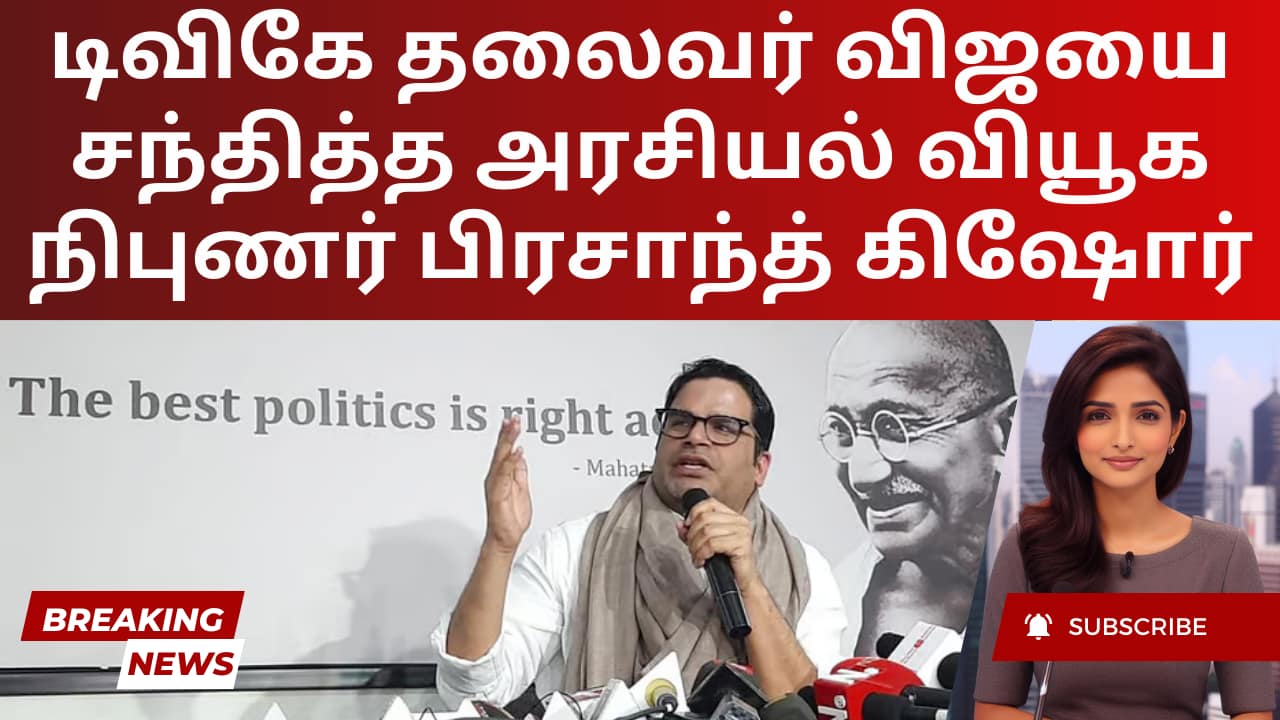 தமிழ்நாடு சட்டமன்றத் தேர்தலுக்கு இன்னும் ஒரு வருடம் மட்டுமே உள்ள நிலையில், அரசியல் வியூக நிபுணர் பிரசாந்த் கிஷோர், திங்களன்று பனையூரில் உள்ள கட்சியின் தலைமையகத்தில் தமிழக வெற்றிக் கழகத் தலைவரும் நடிகருமான விஜயை சந்தித்தார். விஜய் 2026 ஆம் ஆண்டு தேர்தலில் அறிமுகமாகவுள்ளதால் இந்த சந்திப்பு கவனத்தை ஈர்த்துள்ளது.