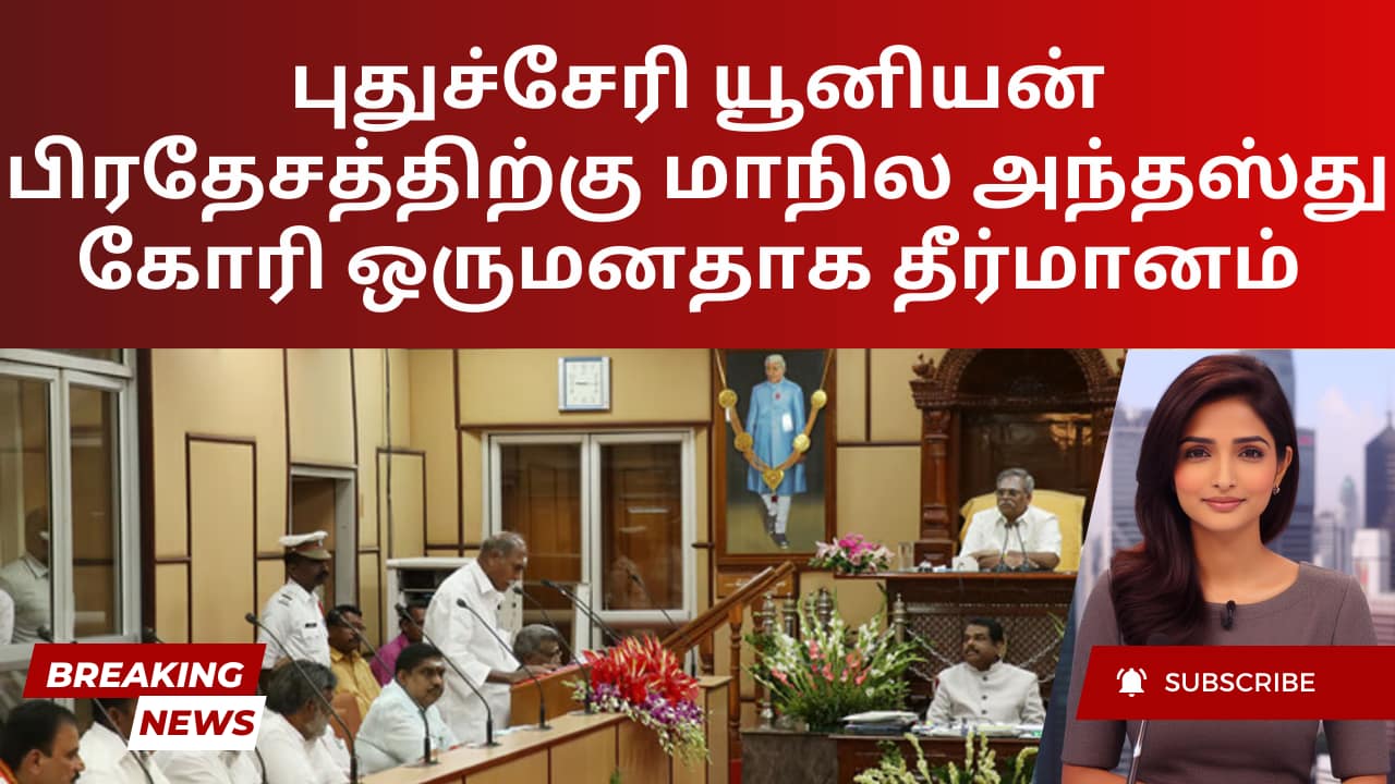 புதுச்சேரி யூனியன் பிரதேசத்திற்கு மாநில அந்தஸ்து கோரி ஒருமனதாக தீர்மானம்