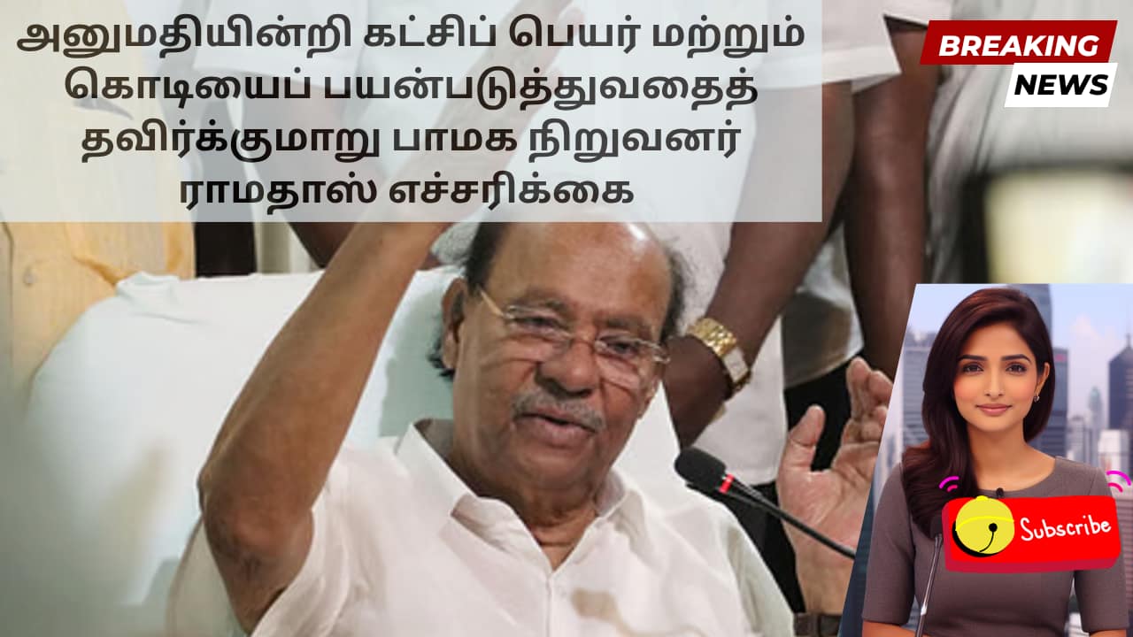 பாட்டாளி மக்கள் கட்சி நிறுவனர் டாக்டர் எஸ் ராமதாஸ் வியாழக்கிழமை கட்சியின் பெயரையும் கொடியையும் அங்கீகரிக்கப்படாமல் பயன்படுத்துவதற்கு எதிராக கடுமையான எச்சரிக்கையை விடுத்தார். இதுபோன்ற எந்தவொரு தவறான பயன்பாடும் கட்சியிலிருந்து நீக்கம் உட்பட ஒழுங்கு நடவடிக்கைக்கு வழிவகுக்கும் என்று அவர் கூறினார். தனது இல்லத்தில் ஊடகங்களுக்கு உரையாற்றிய ராமதாஸ், PMK இன் அதிகாரப்பூர்வ தலைமையகம் தைலாபுரத்தில் அமைந்துள்ளது என்றும், சென்னை உட்பட வேறு எந்த சட்டப்பூர்வ அலுவலகங்களும் இல்லை என்றும் மீண்டும் வலியுறுத்தினார்.
