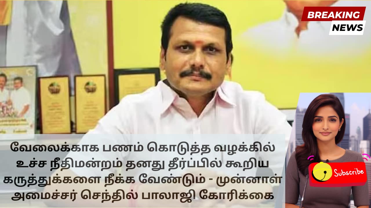 வேலைக்காக பணம் கொடுத்த வழக்கில் உச்ச நீதிமன்றம் தனது தீர்ப்பில் கூறிய கருத்துக்களை நீக்க வேண்டும் – முன்னாள் அமைச்சர் செந்தில் பாலாஜி கோரிக்கை