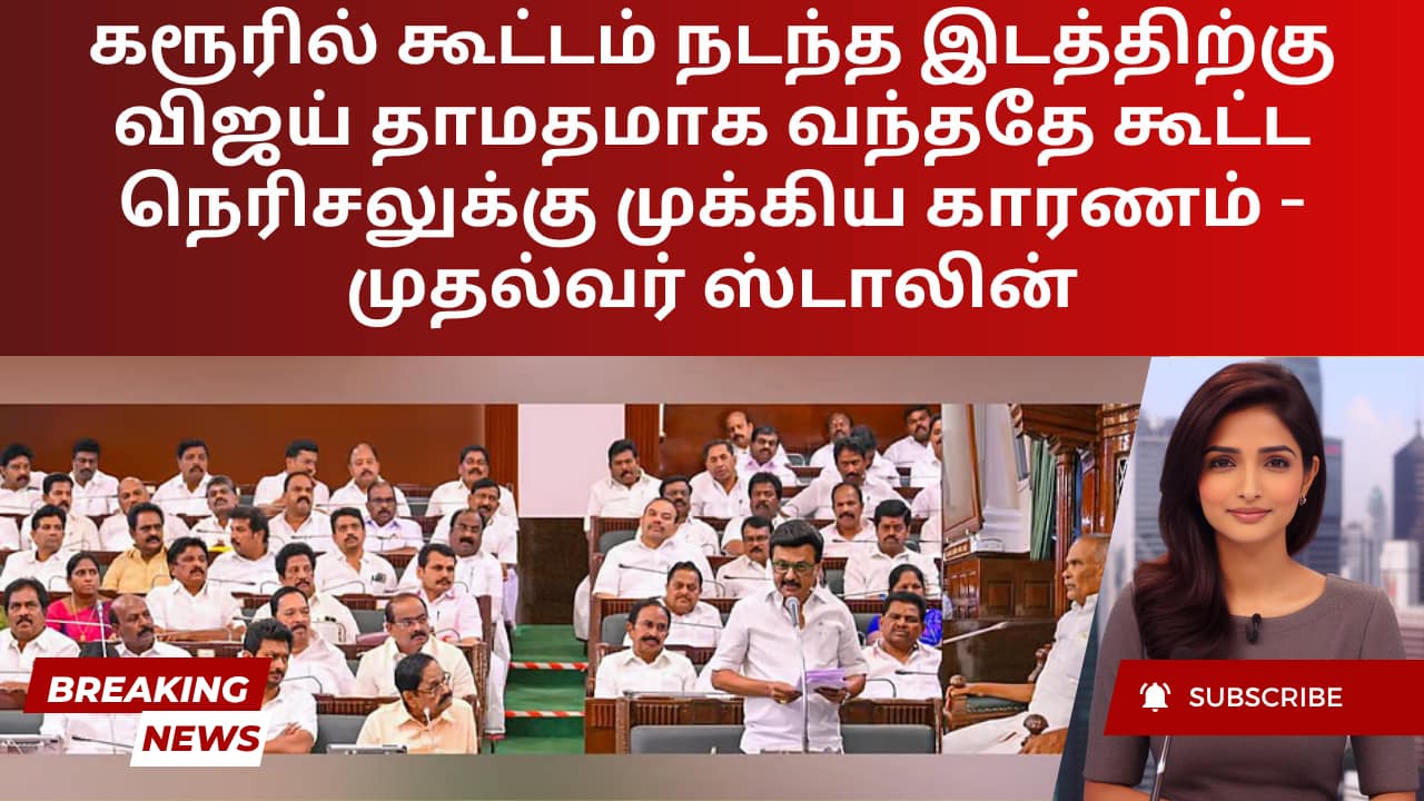 மாநில சட்டமன்றத்தில் உரையாற்றிய முதலமைச்சர், கரூர் வேலுசாமிபுரத்தில் நடந்த நிகழ்வுகளின் வரிசையை விவரித்தார். விஜய் காலை 8:40 மணிக்கு சென்னையிலிருந்து புறப்பட்டு 9:25 மணிக்கு திருச்சியை அடைந்தார் என்று அவர் கூறினார். நாமக்கலில் நடந்த மற்றொரு நிகழ்ச்சியில் கலந்து கொண்ட பிறகு, டிவிகே தலைவர் இரவு 7 மணியளவில் மட்டுமே கரூர் வந்தார். அதாவது நண்பகல் நேரத்தில் பகிரங்கமாக அறிவிக்கப்பட்டதை விட ஏழு மணி நேரம் தாமதமாக. இந்த நீண்ட தாமதம், அரங்கில் கட்டுப்பாடற்ற கூட்ட நெரிசலுக்கு ஒரு முக்கிய காரணியாக அமைந்தது என்று ஸ்டாலின் கூறினார்.