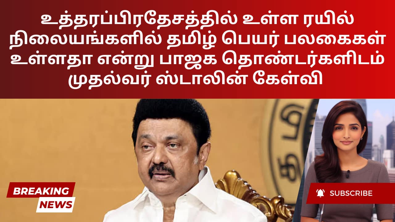 உத்தரப்பிரதேசத்தில் உள்ள ரயில் நிலையங்களில் தமிழ் பெயர் பலகைகள் உள்ளதா என்று பாஜக தொண்டர்களிடம் முதல்வர் ஸ்டாலின் கேள்வி