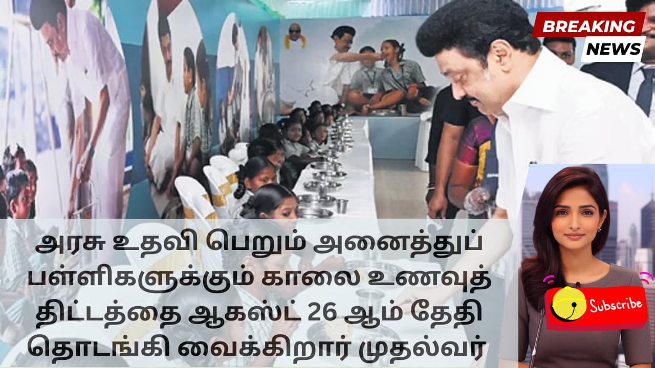 அரசு உதவி பெறும் அனைத்துப் பள்ளிகளுக்கும் காலை உணவுத் திட்டத்தை ஆகஸ்ட் 26 ஆம் தேதி தொடங்கி வைக்கிறார் முதல்வர்