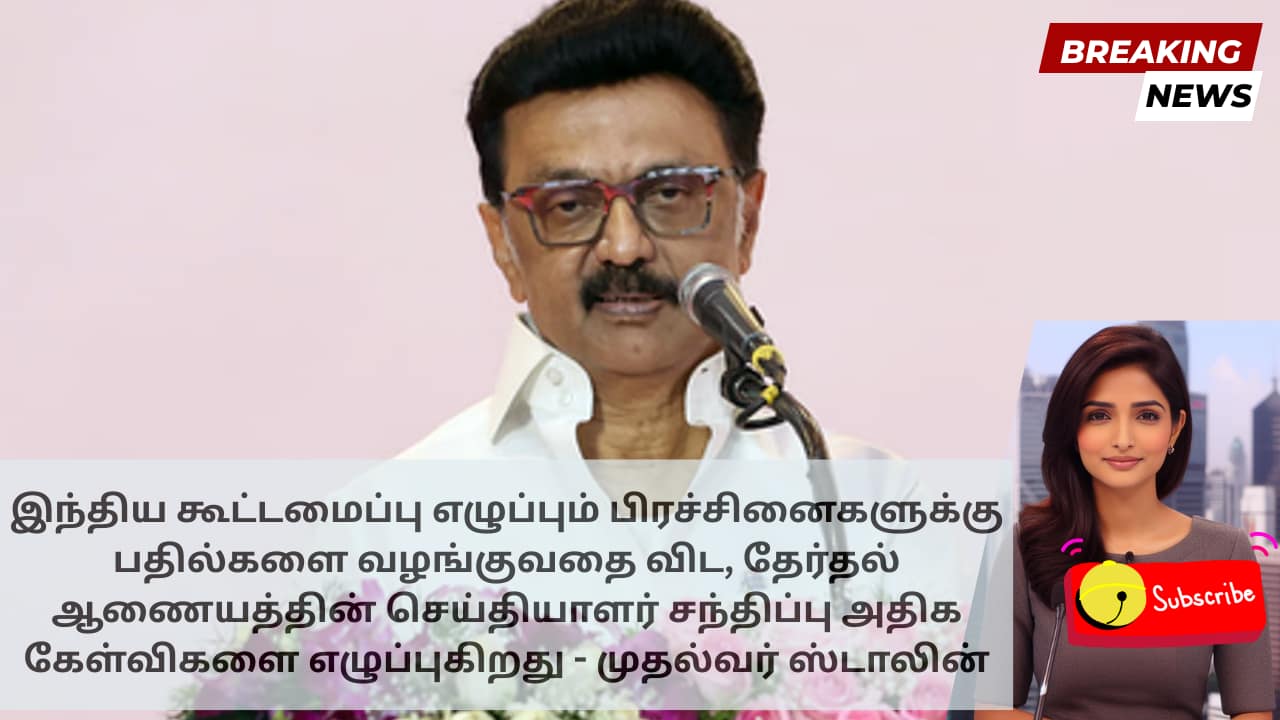 தலைமைத் தேர்தல் ஆணையர் ஞானேஷ் குமார் தலைமையிலான இந்தியத் தேர்தல் ஆணையத்தின் முழு பெஞ்ச் நடத்திய சமீபத்திய செய்தியாளர் சந்திப்பு, வாக்காளர் பட்டியல்களின் சிறப்பு தீவிர திருத்தம் தொடர்பாக தெளிவை விட அதிக சந்தேகங்களை உருவாக்கியுள்ளது என்று முதலமைச்சரும் திமுக தலைவருமான ஸ்டாலின் திங்கள்கிழமை தெரிவித்தார். எழுப்பப்பட்ட பிரச்சினைகள் ஏற்கனவே இந்தியத் தொகுதியால் அறிவிக்கப்பட்டவை, ஆனால் இன்னும் பதிலளிக்கப்படவில்லை என்று அவர் குறிப்பிட்டார்.