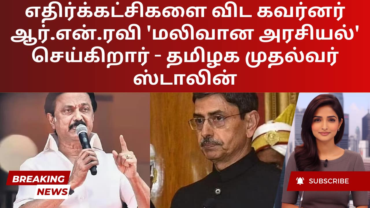 ஞாயிற்றுக்கிழமை முதலமைச்சர் ஸ்டாலின், தமிழக ஆளுநர் ஆர் என் ரவி மீது கடுமையான தாக்குதலைத் தொடுத்து, எதிர்க்கட்சிகளை விட மோசமான “மலிவான அரசியலில்” ஈடுபடுவதாகக் குற்றம் சாட்டினார். திமுக தலைமையிலான அரசு மற்றும் கட்சிக்கு எதிராக ஆளுநர் பொய்களைப் பரப்புவதாக ஸ்டாலின் குற்றம் சாட்டினார். தனது நிர்வாகத்தால் செயல்படுத்தப்பட்ட ஏராளமான நலத்திட்டங்களை எடுத்துரைத்த முதல்வர், மக்கள் சார்பு முயற்சிகளில் தமிழ்நாடு முன்னோடியாக மாறியுள்ளது என்றும், திராவிட மாதிரி அரசு முழு நாட்டிற்கும் வழி காட்டுகிறது என்றும் கூறினார்.