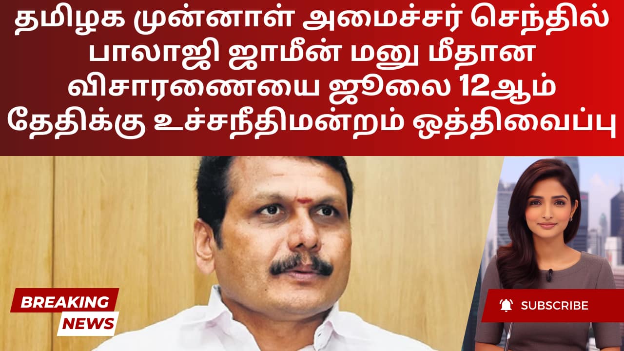 தமிழக முன்னாள் அமைச்சர் செந்தில் பாலாஜியின் ஜாமீன் மனு மீதான விசாரணையை ஜூலை 12-ம் தேதிக்கு உச்சநீதிமன்றம் ஒத்திவைத்துள்ளது. பணமோசடி வழக்கில் பாலாஜியை அமலாக்க இயக்குனரகம் கடந்த ஆண்டு கைது செய்தது. சொலிசிட்டர் ஜெனரல் துஷார் மேத்தா கூடுதல் அவகாசம் கோரியதை அடுத்து, நீதிபதிகள் அபய் எஸ் ஓகா மற்றும் அகஸ்டின் ஜார்ஜ் மாசிஹ் ஆகியோர் அடங்கிய அமர்வு வழக்கை ஒத்திவைத்தது.