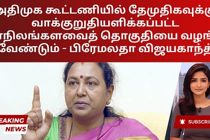 2024 நாடாளுமன்றத் தேர்தல் பேச்சுவார்த்தைகளின் போது ஒப்புக் கொள்ளப்பட்டபடி, தேமுதிகவுக்கு மாநிலங்களவை இடத்தை ஒதுக்குவதற்கான தனது உறுதிப்பாட்டை அதிமுக மதிக்க வேண்டும் என்று தேமுதிக தலைவர் பிரேமலதா விஜயக...