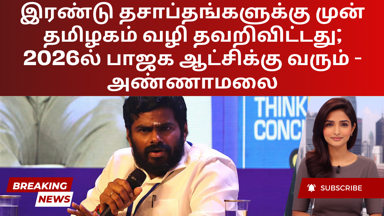 திங்க்எடு மாநாடு 2025 இல் பேசிய தமிழ்நாடு பாஜக தலைவர் கே அண்ணாமலை, இரண்டு தசாப்தங்களுக்கு முன்பே மாநிலம் தனது பாதையை இழந்துவிட்டது என்றும், 2026 தமிழ்நாடு சட்டமன்றத் தேர்தலில் பாஜக ஆட்சிக்கு வரும் என்...