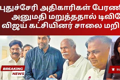 டிசம்பர் 5 ஆம் தேதி புதுச்சேரியில் பொது பேரணி நடத்த டிவிகே தலைவர் விஜய் திட்டமிட்டிருந்த நிலையில், செவ்வாய்க்கிழமை பேரணிக்கு போலீசார் அனுமதி மறுத்ததால், அது பின்னடைவை சந்தித்துள்ளது. திறந்தவெளி பொதுக்...