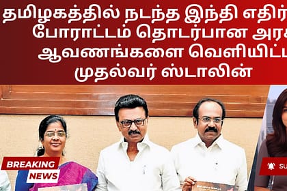முதலமைச்சர் மு க ஸ்டாலின் திங்கள்கிழமை தலைமைச் செயலகத்தில் ‘இந்தி எதிர்ப்புப் போராட்டம் – முழுமையான அரசு ஆவணங்கள்’ என்ற நூலை வெளியிட்டார். இந்த நூலைத் தமிழ்நாடு ஆவணக்காப்பகம் மற்றும் வரலாற...
