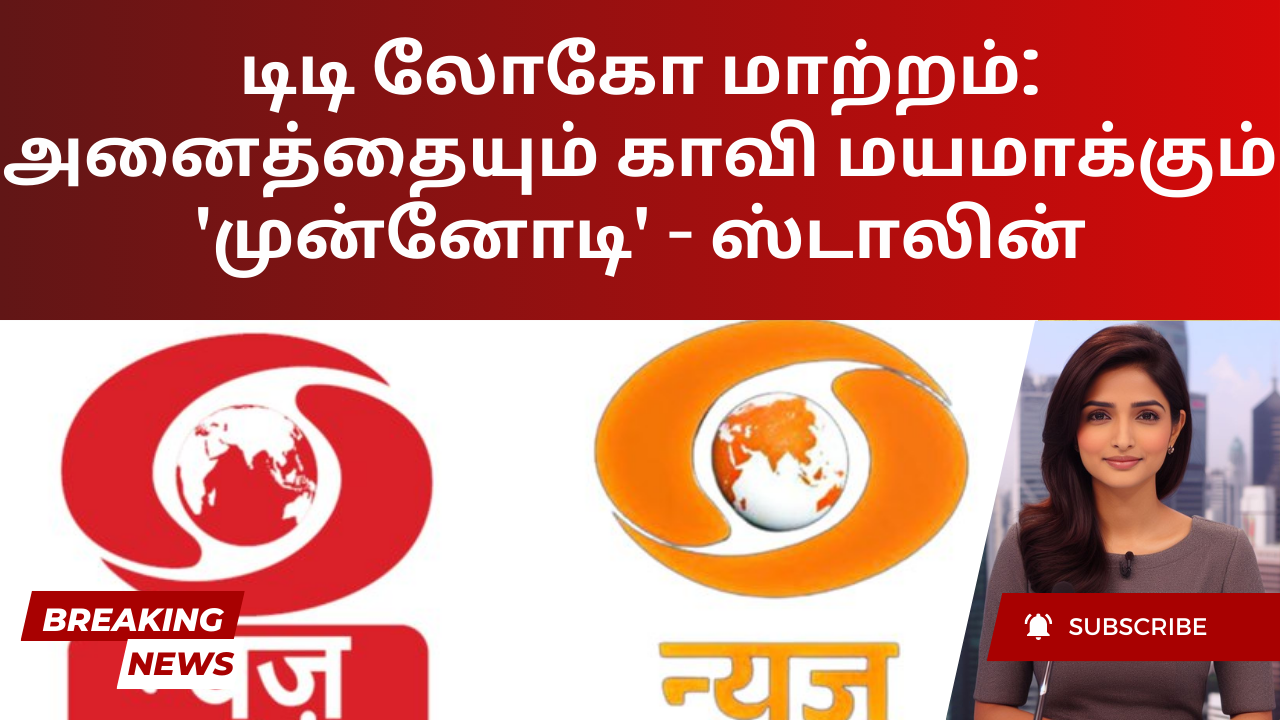 திமுக தலைவரும், தமிழக முதல்வருமான மு.க.ஸ்டாலின், சமீபத்தில் தூர்தர்ஷன் லோகோவை சிவப்பு நிறத்தில் இருந்து ஆரஞ்சு நிறத்திற்கு மாற்றியதை விமர்சித்தார், இது நிறுவனங்களை காவி நிறமாக்கும் பரந்த செயல்திட்டத்த...