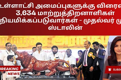 தமிழகம் முழுவதும் உள்ளாட்சி அமைப்புகளுக்கு மொத்தம் 3,634 மாற்றுத்திறனாளிகள் பரிந்துரைக்கப்படுவார்கள் என்று முதலமைச்சர் மு க ஸ்டாலின் சனிக்கிழமை அறிவித்தார். இந்த நியமனங்களுக்கான விண்ணப்ப நடைமுறை ஜூலை ...
