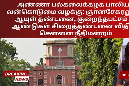 19 வயது அண்ணா பல்கலைக்கழக மாணவியை பாலியல் வன்கொடுமை செய்த வழக்கில் ஒரே குற்றவாளியான ஞானசேகரனுக்கு திங்கள்கிழமை சென்னை மகிளா நீதிமன்றம் ஆயுள் தண்டனை விதித்து தீர்ப்பளித்தது, குறைந்தபட்சம் 30 ஆண்டுகள் க...