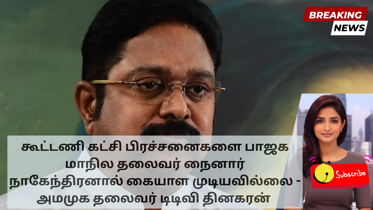 சனிக்கிழமை மதுரையில் பேசிய அம்மா மக்கள் முன்னேற்றக் கழகத் தலைவர் டிடிவி தினகரன், பாஜகவின் தற்போதைய மாநிலத் தலைமையின் கீழ் கூட்டணி விவகாரங்களை கையாளும் விதத்தை விமர்சித்தார். பாஜக மாநிலத் தலைவர் நயினார...