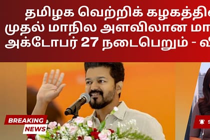 தமிழக வெற்றிக் கழகத்தின் முதல் மாநில அளவிலான மாநாடு அக்டோபர் 27ஆம் தேதி விழுப்புரம் மாவட்டம் விக்கிரவாண்டியில் மாலை 4 மணிக்கு நடைபெற உள்ளது. இந்த தகவலை டிவிகே தலைவரும், நடிகருமான விஜய் சென்னையில் அத...