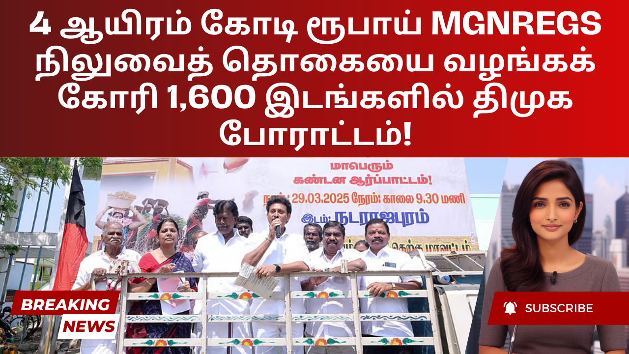 மகாத்மா காந்தி தேசிய ஊரக வேலைவாய்ப்பு உறுதித் திட்டத்தின் கீழ் கடந்த ஐந்து மாதங்களாக நிலுவைத் தொகையாக 4,034 கோடி ரூபாயை விடுவிக்கத் தவறிய மத்திய அரசைக் கண்டித்து, சனிக்கிழமை தமிழகம் முழுவதும் 1,600க்க...
