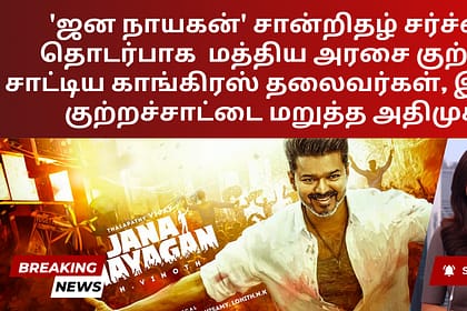 காங்கிரஸ் தலைவர்களான பிரவீன் சக்கரவர்த்தி மற்றும் மக்களவை உறுப்பினர் எஸ் ஜோதிமணி ஆகியோர் வியாழக்கிழமை அன்று, நடிகர்-அரசியல்வாதியான விஜய்யின் பன்மொழிப் படமான ‘ஜன நாயகன்’ படத்திற்கு சான்றிதழ...