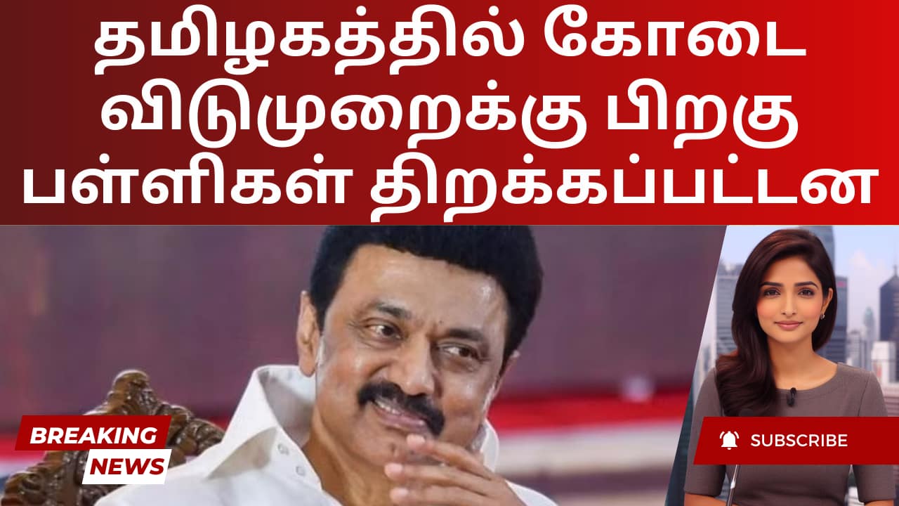 கோடை விடுமுறைக்கு பிறகு தமிழகம் முழுவதும் பள்ளிகள் திங்கள்கிழமை திறக்கப்பட்டன. மாநில அரசு, உதவிபெறும் மற்றும் தனியார் பள்ளிகள் மாணவர்களை வரவேற்றன. ஜூன் 4 ஆம் தேதி அறிவிக்கப்பட்ட வெப்பச் சூழல் மற்றும் மக்களவைத் தேர்தல் முடிவுகள் காரணமாக மீண்டும் திறப்பது தாமதமானது. முதல்வர் ஸ்டாலின், மாணவர்கள் மற்றும் ஆசிரியர்களுக்கு தனது வாழ்த்துகளைத் தெரிவித்தார்.