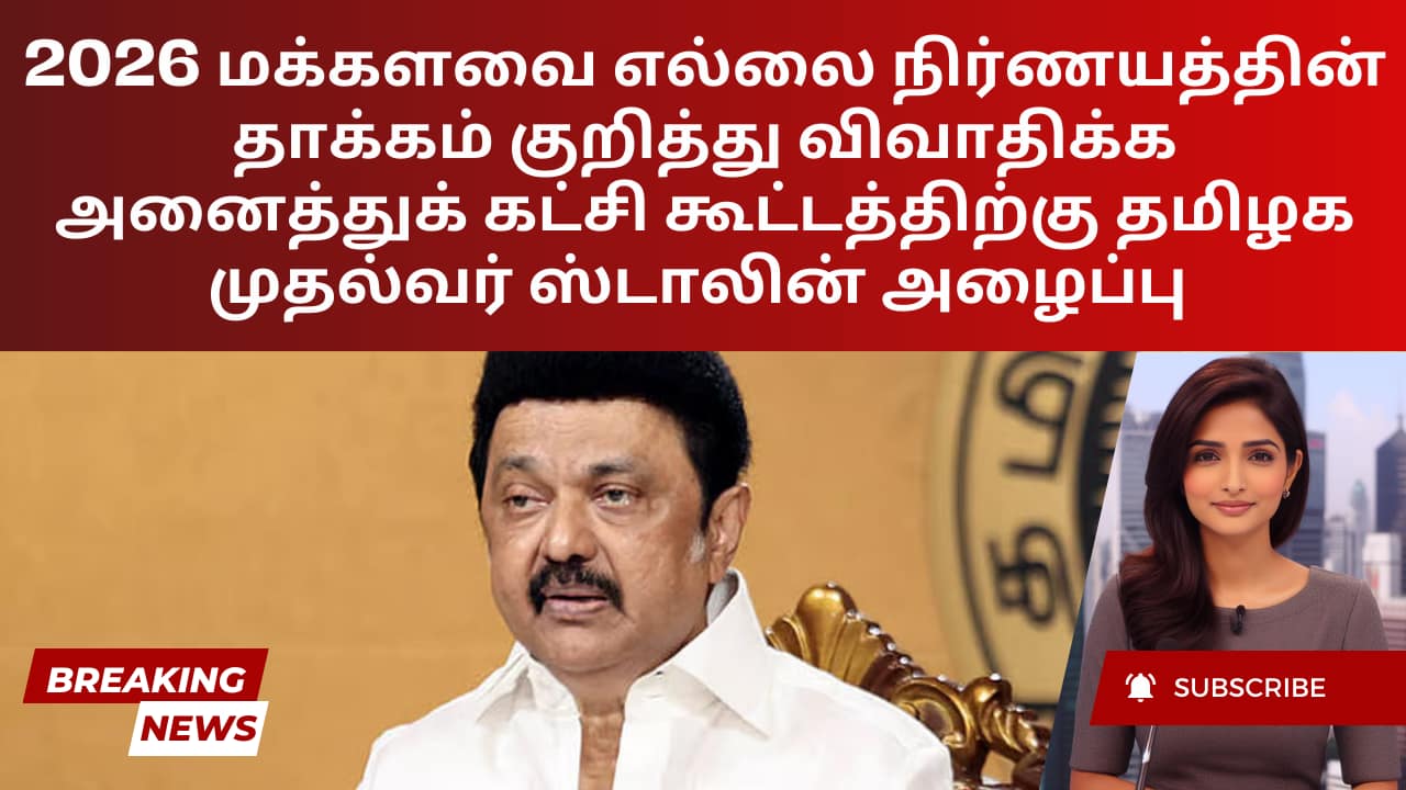 2026 மக்களவை எல்லை நிர்ணயத்தால் மாநிலத்தில் ஏற்படும் தாக்கம் குறித்து விவாதிக்க மார்ச் 5 ஆம் தேதி அனைத்துக் கட்சி கூட்டத்தை நடத்துவதாக தமிழக முதல்வர் ஸ்டாலின் அறிவித்துள்ளார். மொத்தம் 40 பதிவுசெய்யப்பட்ட அரசியல் கட்சிகள் அழைக்கப்பட்டுள்ளன, மேலும் அனைத்துக் கட்சிகளும் பங்கேற்று ஒற்றுமையை முன்வைக்க வேண்டும் என்று ஸ்டாலின் வலியுறுத்தியுள்ளார். முன்மொழியப்பட்ட எல்லை நிர்ணயம் நாடாளுமன்றத்தில் தென் மாநிலங்களின் பிரதிநிதித்துவத்திற்கு குறிப்பிடத்தக்க அச்சுறுத்தலை ஏற்படுத்துவதால், தமிழ்நாடு இப்போது அதன் உரிமைகளுக்காகப் போராட வேண்டிய கட்டாயத்தில் உள்ளது என்று அவர் வலியுறுத்தினார்.