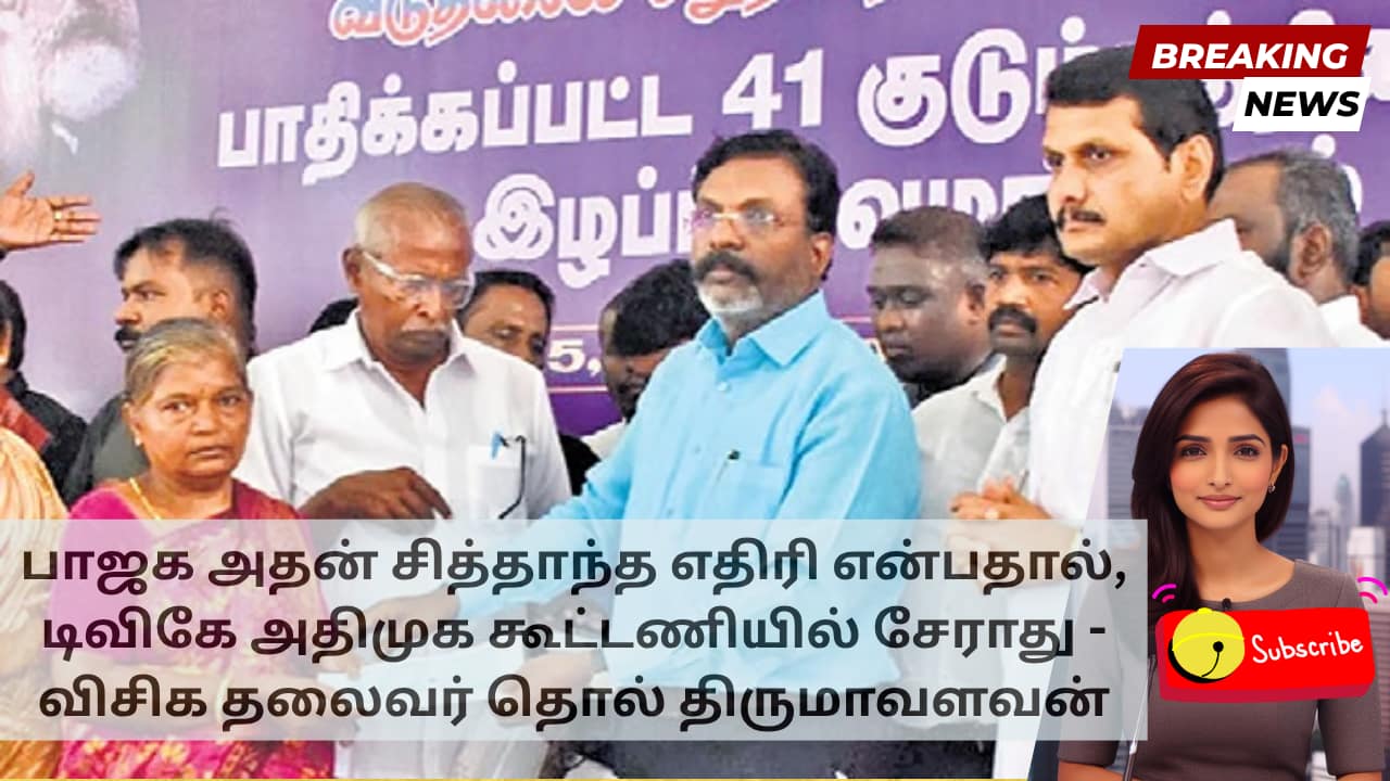 கூட்டணி கட்சியாக AIADMK-வின் நம்பகத்தன்மையை திருமாவளவன் கேள்வி எழுப்பினார், BJP TVK-வின் சித்தாந்த எதிரியாகக் கருதப்பட்டால், அது BJP, AIADMK மற்றும் TVK ஆகியவை ஒரே கூட்டணியில் இணைந்து வாழ முடியுமா என்ற கேள்வியை எழுப்புகிறது என்று கூறினார். AIADMK பாஜகவுடன் தொடர்ந்து இணைந்தால், அது கட்சியின் அரசியல் நிலைத்தன்மை மற்றும் நம்பகத்தன்மையைப் பிரதிபலிக்கும் என்றும் அவர் மேலும் கூறினார்.