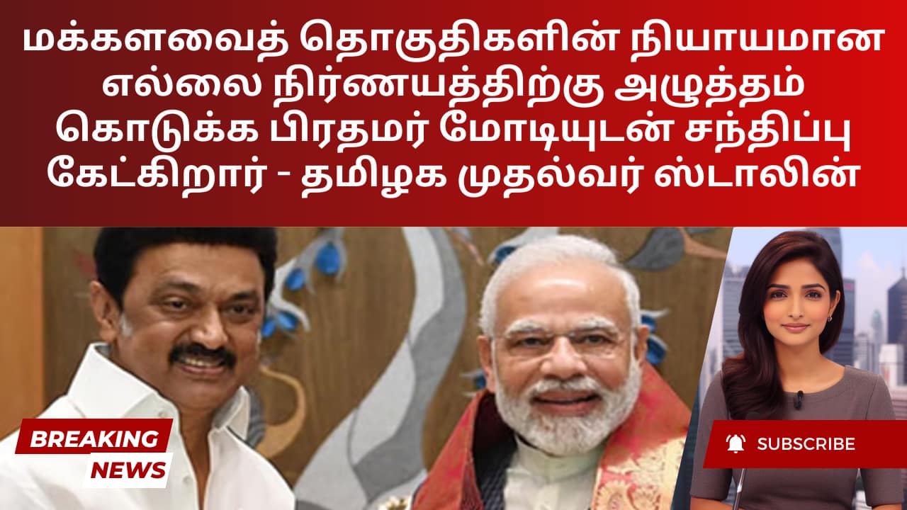 மக்களவைத் தொகுதிகளின் நியாயமான எல்லை நிர்ணயம் குறித்து விவாதிக்க பிரதமர் நரேந்திர மோடியுடன் தமிழக முதல்வர் ஸ்டாலின் சந்திப்புக்கு அனுமதி கோரியுள்ளார். பல்வேறு அரசியல் கட்சிகளைச் சேர்ந்த நாடாளுமன்ற உறுப்பினர்களுடன் சேர்ந்து தங்கள் கவலைகளை தெரிவிக்க ஒரு சந்திப்பை அவர் கோரியுள்ளார். சென்னையில் நடைபெற்ற நியாயமான எல்லை நிர்ணயம் குறித்த கூட்டு நடவடிக்கைக் குழு கூட்டத்தின் போது நிறைவேற்றப்பட்ட தீர்மானங்களைத் தொடர்ந்து இந்த கோரிக்கை விடுக்கப்பட்டுள்ளது.