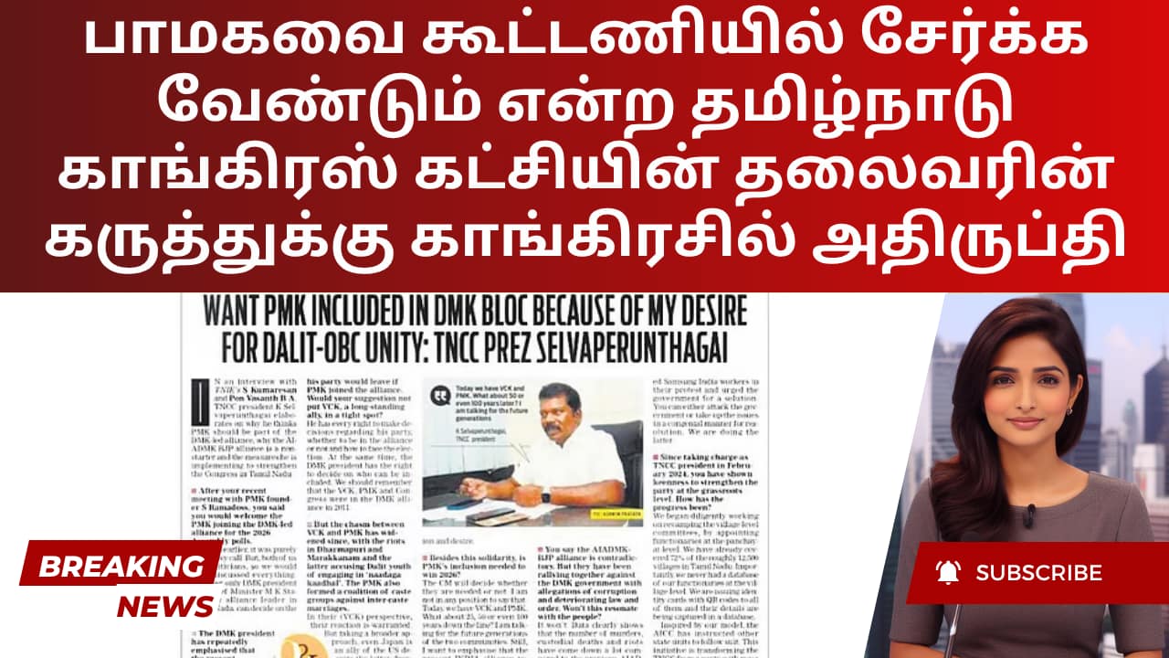 தமிழ்நாடு காங்கிரஸ் கமிட்டி தலைவர் கே செல்வபெருந்தகை, 2026 சட்டமன்றத் தேர்தலில் திமுக தலைமையிலான இந்திய கூட்டணியில் PMK-ஐச் சேர்ப்பதற்கு தனது ஆதரவை மீண்டும் வலியுறுத்தி, தி நியூ இந்தியன் எக்ஸ்பிரஸ் பத்திரிகைக்கு அளித்த பேட்டியில் கூறிய கருத்துகள், அவரது கட்சிக்குள்ளும், முக்கிய கூட்டாளியான VCK-யிடமிருந்தும் விமர்சனங்களைத் தூண்டியுள்ளன. தலித்துகள் மற்றும் பிற்படுத்தப்பட்டோர் மத்தியில் ஒற்றுமையை வளர்க்கும் நோக்கில் அவர் அளித்த பரிந்துரை, 2014 முதல் பிரதமர் நரேந்திர மோடியின் நிலையான ஆதரவாளராக இருந்து வரும் ஒரு கட்சியுடன் இணைவதன் பின்னணியில் உள்ள நியாயத்தை கேள்விக்குள்ளாக்கியது, உடனடி எதிர்ப்புகளை சந்தித்தது.