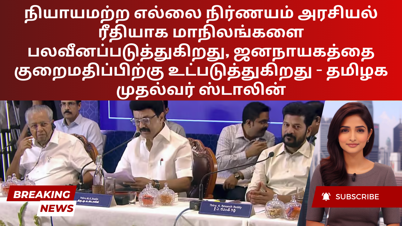 சென்னையில் நடைபெற்ற நியாயமான எல்லை நிர்ணயத்திற்கான கூட்டு நடவடிக்கைக் குழு கூட்டத்தில் உரையாற்றிய தமிழக முதல்வர் ஸ்டாலின், நியாயமற்ற எல்லை நிர்ணயத்தால் மாநிலங்கள் மற்றும் ஜனநாயகம் மீது ஏற்படும் தீய தாக்கத்தை வலியுறுத்தினார். போதுமான அரசியல் பலம் இல்லாததால் நீதிக்கான மாநிலத்தின் குரல் புறக்கணிக்கப்படுவதாகவும், இது மாநிலத்தின் தேசிய கவனத்தை ஈர்க்கும் திறனைத் தடுப்பதாகவும் அவர் கவலை தெரிவித்தார். நாடாளுமன்ற பிரதிநிதித்துவத்தைக் குறைப்பது மாநிலத்தின் அரசியல் செல்வாக்கை பலவீனப்படுத்தும் என்று ஸ்டாலின் எச்சரித்தார், மணிப்பூரில் வன்முறை குறித்து மத்திய அரசு நீண்ட காலமாக மௌனம் காப்பது அரசியல் அதிகாரம் இல்லாத மாநிலங்கள் எவ்வாறு பெரும்பாலும் புறக்கணிக்கப்படுகின்றன என்பதற்கான ஒரு எடுத்துக்காட்டு என்று குறிப்பிட்டார்.
