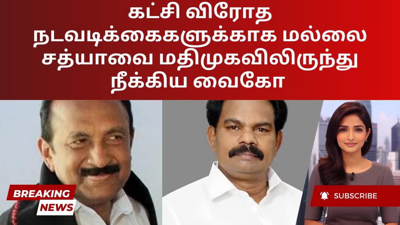 கட்சி விரோத நடவடிக்கைகளை காரணம் காட்டி, மதிமுக பொதுச் செயலாளர் வைகோ, தனது நீண்டகால கூட்டாளியான மல்லை சி இ சத்யாவை கட்சியிலிருந்து நீக்கினார். துணைப் பொதுச் செயலாளராகப் பணியாற்றி வந்த சத்யா, கட்சியின் முதன்மை உறுப்பினர் பதவியிலிருந்தும் நீக்கப்பட்டார்.