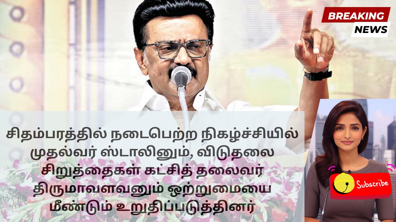 சிதம்பரத்தில் நடைபெற்ற நிகழ்ச்சியில் முதல்வர் ஸ்டாலினும், விடுதலை சிறுத்தைகள் கட்சித் தலைவர் திருமாவளவனும் ஒற்றுமையை மீண்டும் உறுதிப்படுத்தினர்