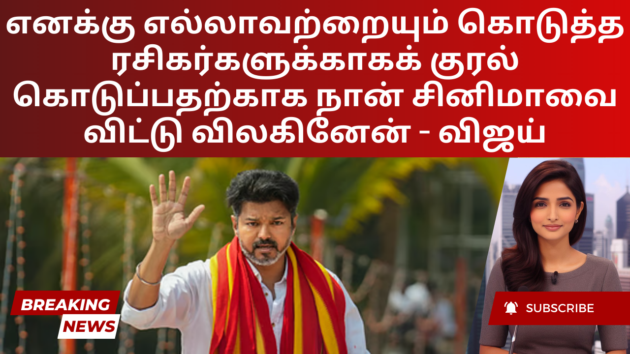 மலேசியாவில் நடைபெற்ற, பெரிதும் எதிர்பார்க்கப்பட்ட தனது ‘ஜன நாயகன்’ திரைப்படத்தின் இசை வெளியீட்டு விழாவில் பேசிய நடிகர்-அரசியல்வாதியான விஜய், தனக்கு எல்லாவற்றையும் கொடுத்த தனது ரசிகர்களுக்காக அரசியலில் ஈடுபடுவதற்காக சினிமாவில் இருந்து விலகுவதாக தனது முடிவை அறிவித்தார். ஒரு பிரம்மாண்டமான கூட்டத்தில் உரையாற்றிய அவர், தனது ரசிகர்களின் அன்பும் விசுவாசமுமே தன்னை திரைப்படங்களைக் கைவிட்டு பொது வாழ்வில் நுழையத் தூண்டியதாகக் கூறினார்.